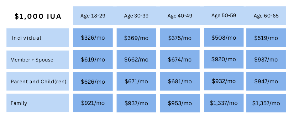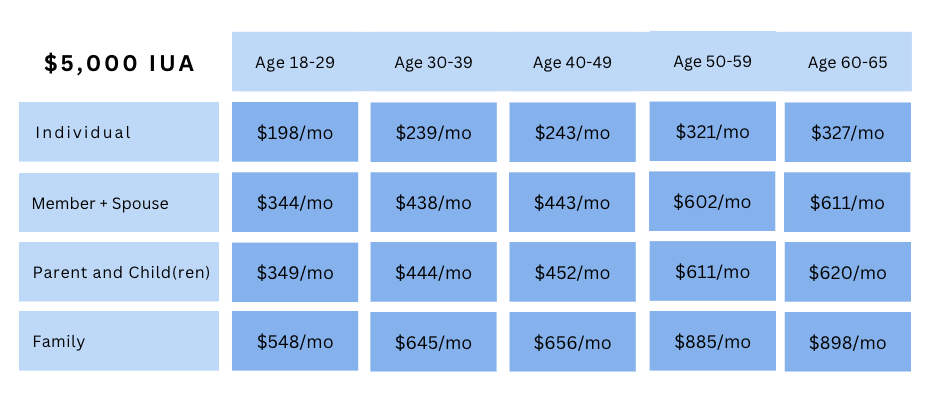 TIP: If you select the $5,000 IUA, you may be saving monthly, but if your family has 3 major medical needs in a year, you could be responsible for $15,000 ($5000 X 3) out of pocket.